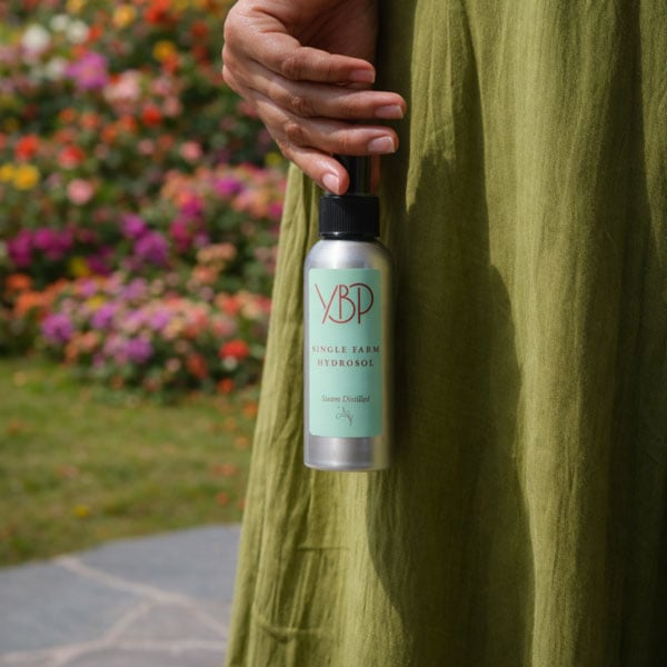 At YBP, we distill our hydrosols using fresh, single-origin botanicals. Nothing dried, nothing added. We work closely with the farms and the land where these plants are grown, supporting small growers across India and beyond.
